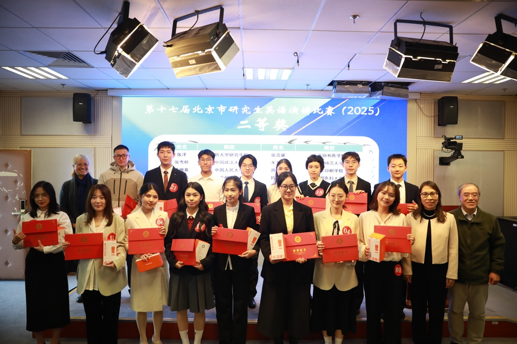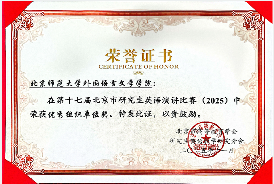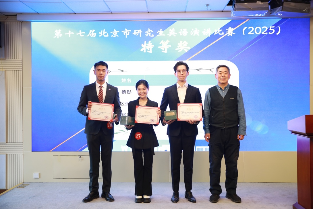 11月29日上午,第十七届北京市研究生英语演讲比赛决赛在北京林业大学落下帷幕。北京师范大学2025级教育学部硕士生张羽获特等奖,2025级马克思主义学院硕士生刘嘉雯和教育学部硕士生黎诗雅获二等奖。外国语言文学学院公共外语教学研究部教师孔京京获优秀指导教师奖,夏晓燕获优秀组织个人奖。外国语言文学学院获优秀组织单位奖。