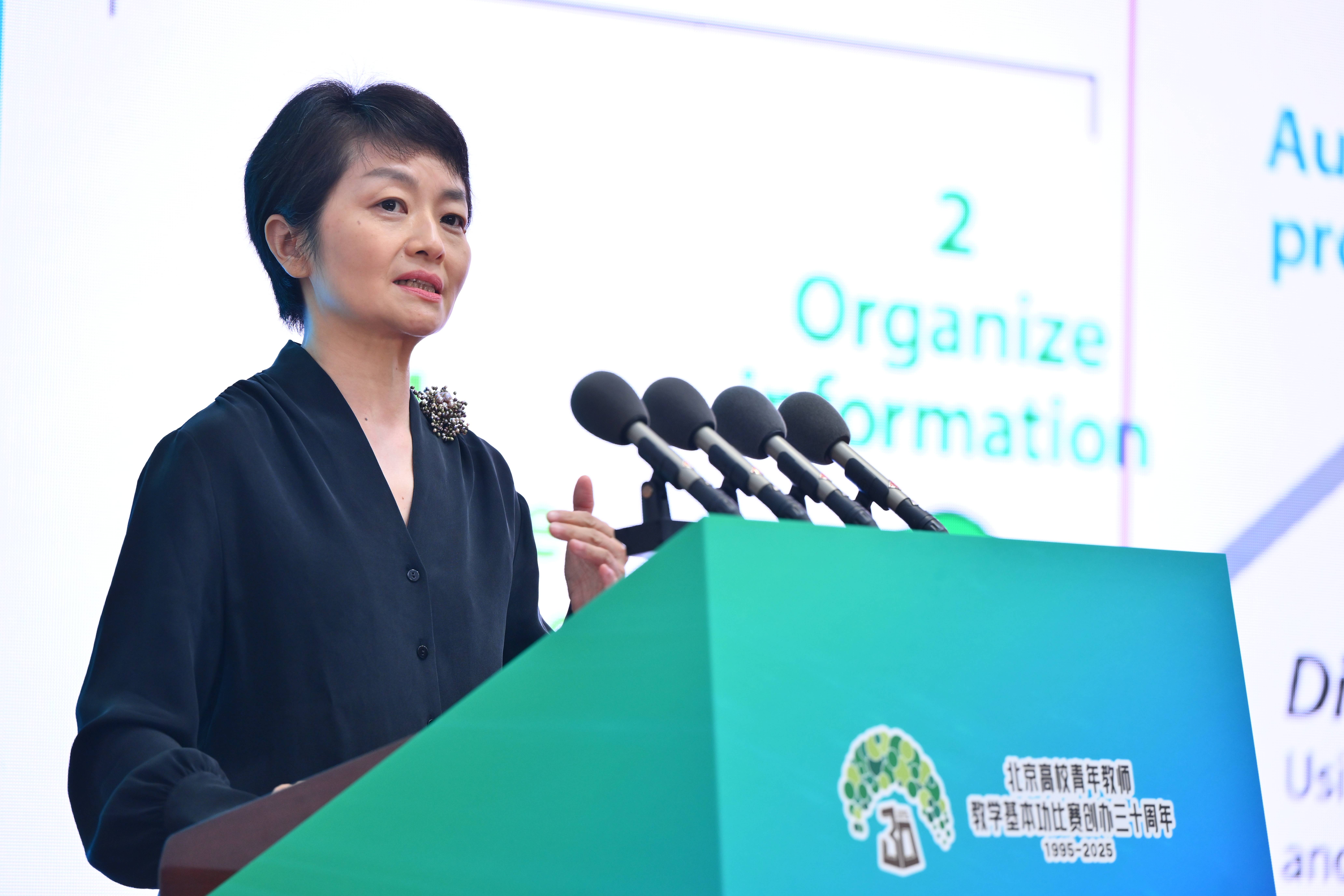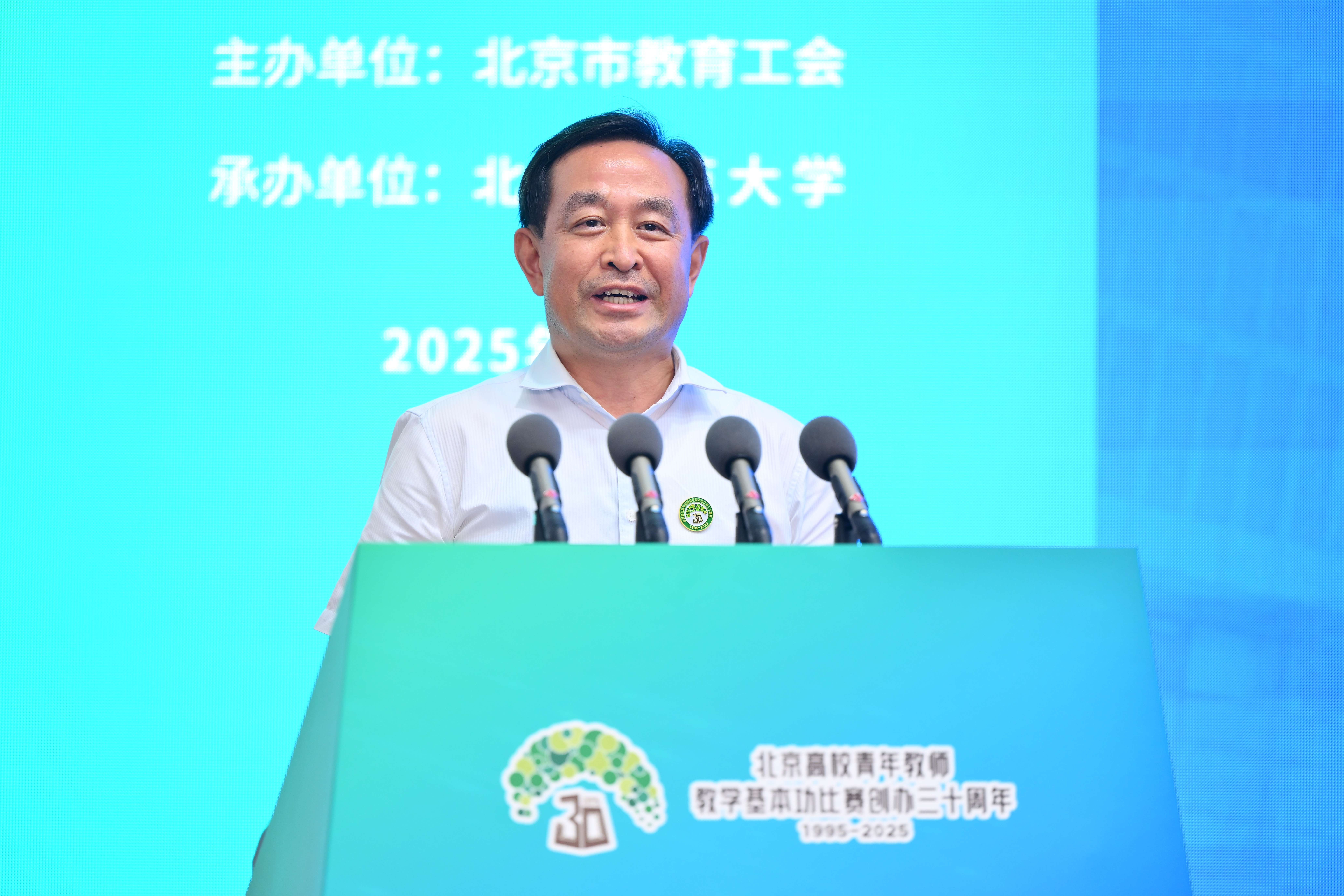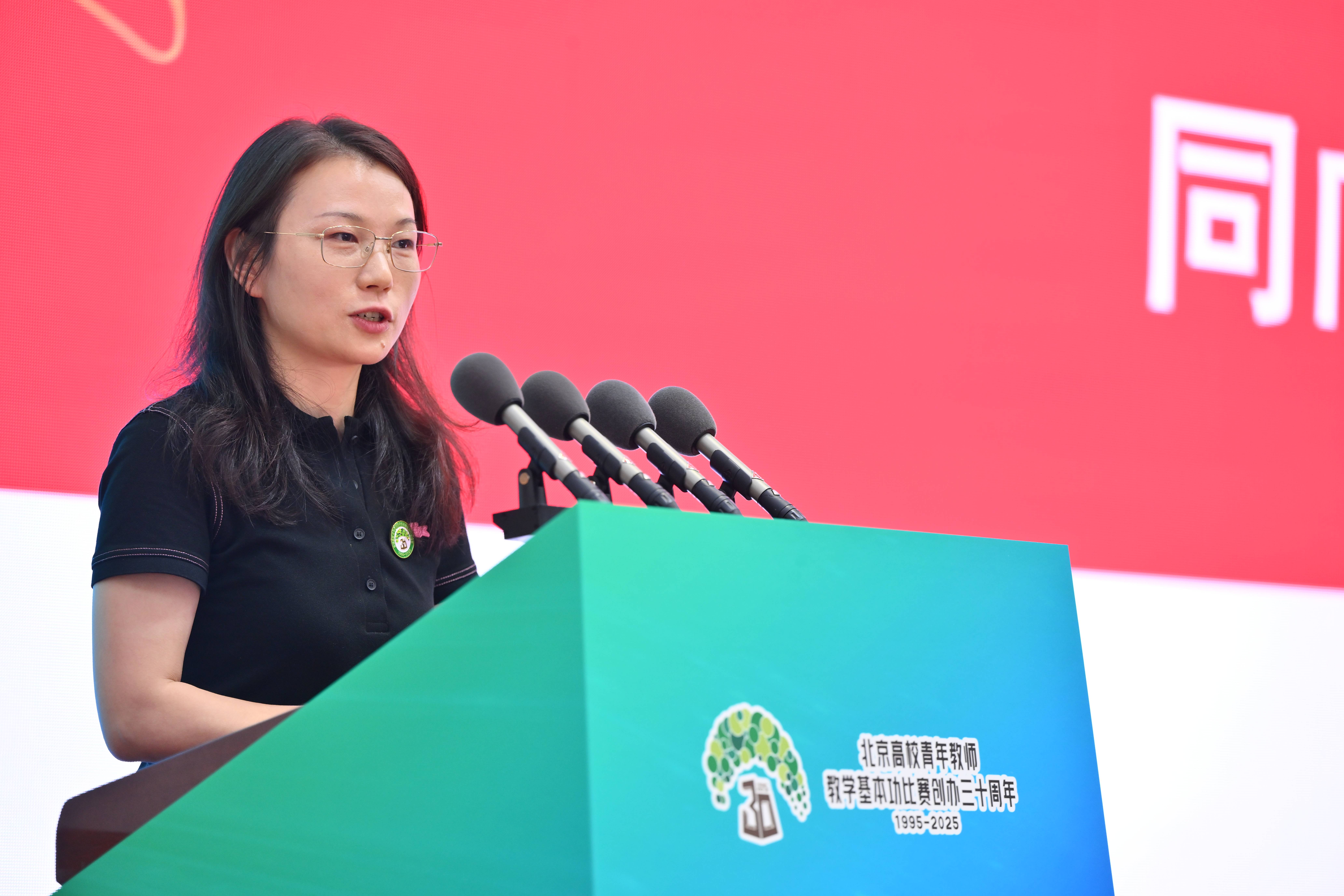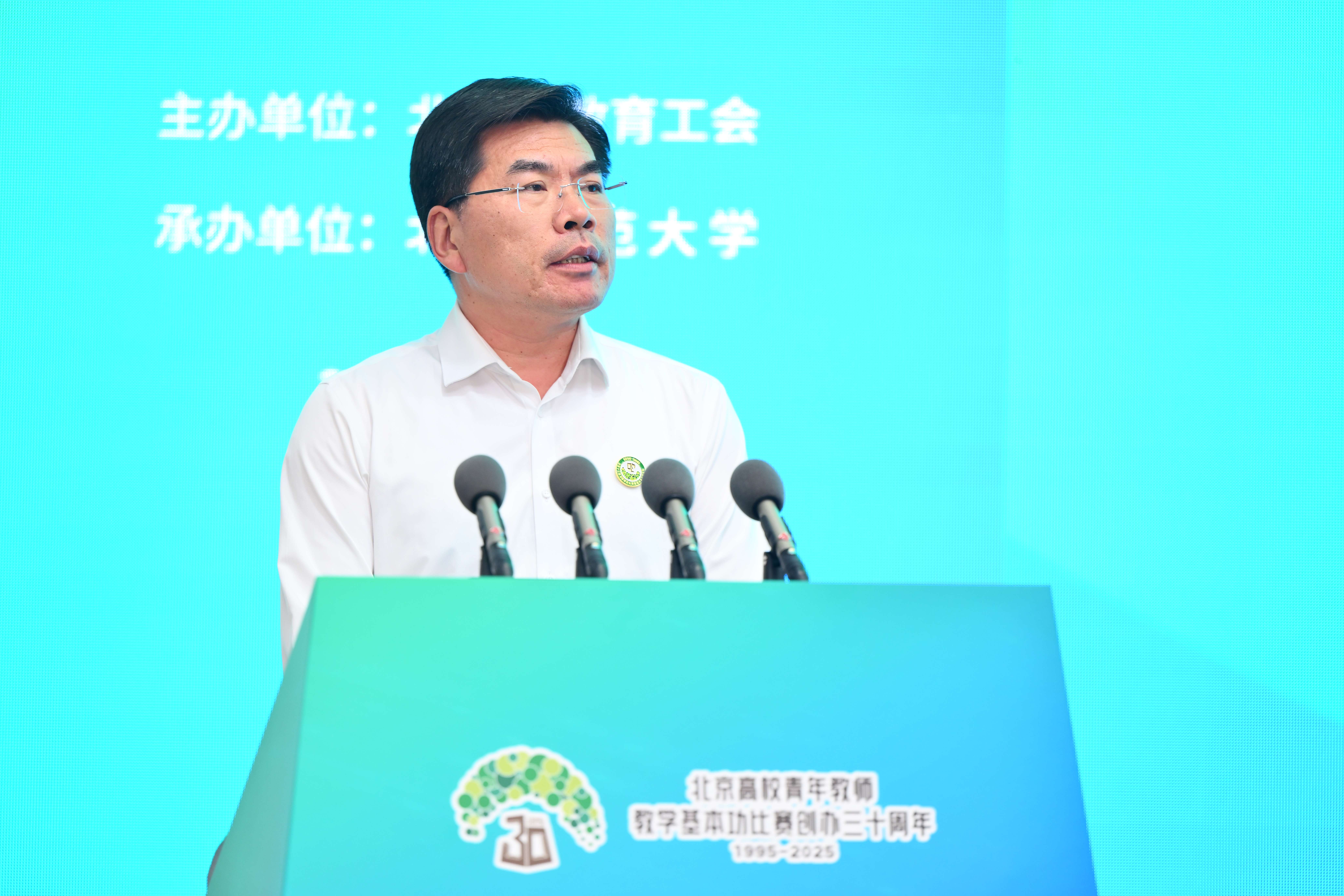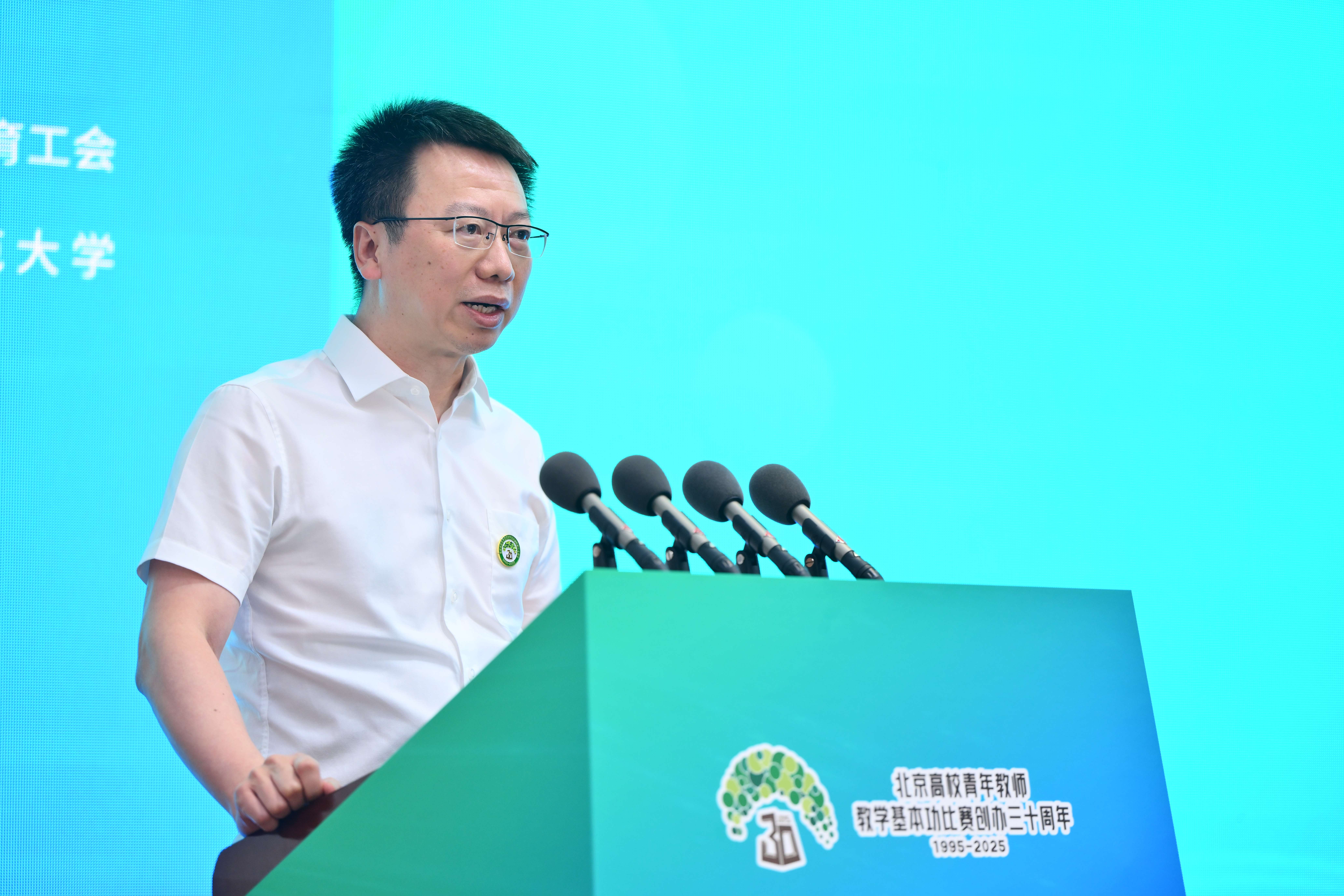 张雁云代表承办高校致辞,他回顾了青教赛30年的发展历程,指出青教赛已经从最初的教学“技能比武”逐步发展为青年教师成长成才的“孵化器”,成为首都教育系统的品牌赛事。北师大作为青教赛的首创高校,高度重视青年教师的成长成才,近年来学校以“四有”好老师标准为引领,构建起“价值引领—能力锻造—平台赋能”的青年教师培养体系,助力一批批青年教师成长为“四有”标识鲜明的骨干教师,为教育强国建设贡献师大力量。