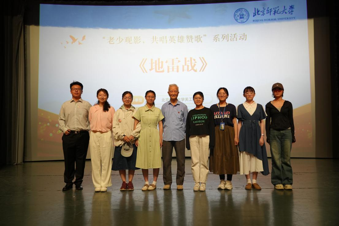5月27日下午,为深入贯彻落实中办、国办《关于加强新时代关心下一代工作委员会工作的意见》和教育部党组《关于加强新时代全国教育系统关心下一代工作委员会工作的意见》精神,纪念中国人民抗日战争胜利80周年,弘扬伟大抗战精神,歌颂英雄爱国情怀,铭记烈士民族气节,充分发挥“五老”育人作用,北京师范大学关工委联合党委学生工作部、艺术与传媒学院关工委在北国剧场举办了“老少观影,共唱英雄赞歌”第二期活动,来自多个学部院系的120余名学生和退休老教师共同观看了抗战题材经典影片《地雷战》。
