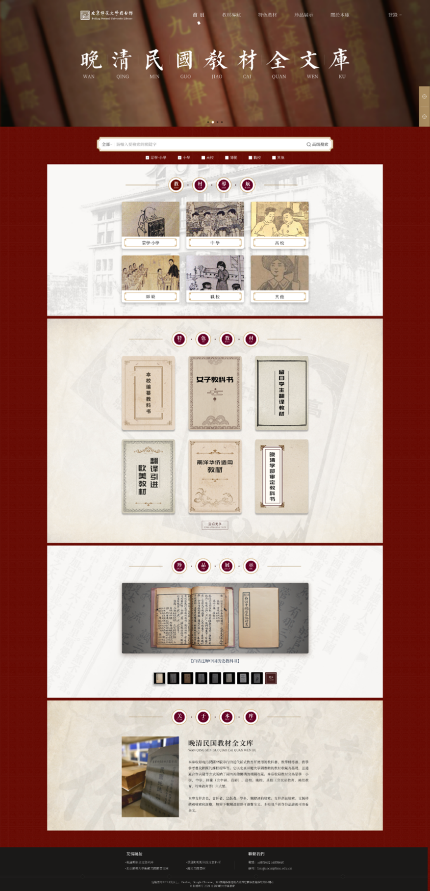 北京师范大学依托百年积淀形成的学科和学术优势,长期参与中国基础教育改革的探索和实践,在中小学课程标准制定、教材编写、教育研究等方面具有悠久的历史传统,学校不同时期的诸多名师都曾主持或参与基础教育教材的编写工作。北师大图书馆对于教材特色资源的收藏历史也非常悠久,早在1934年,图书馆即确定了“对30年来所出之各种教科书为整个之采访,大中小各等级兼收并蓄”的教材采购标准。2002年百年校庆之际,图书馆正式出版《北京师范大学图书馆藏师范学校及中小学中文教科书书目:清末至1949年》,收录基础教育教材2600余种。2008年建成的“馆藏1949年前师范学校及中小学教科书全文库”即收录了上述2600余种教材。此次全新改版扩容的“晚清民国教材全文库”,收录范围从基础教育教材扩展到了大学教材、职业学校及专业学校教材等,在馆藏的基础上通过合作协议增加了部分收藏机构和个人的教材收藏,数据库内容更趋丰富,覆盖面更广。