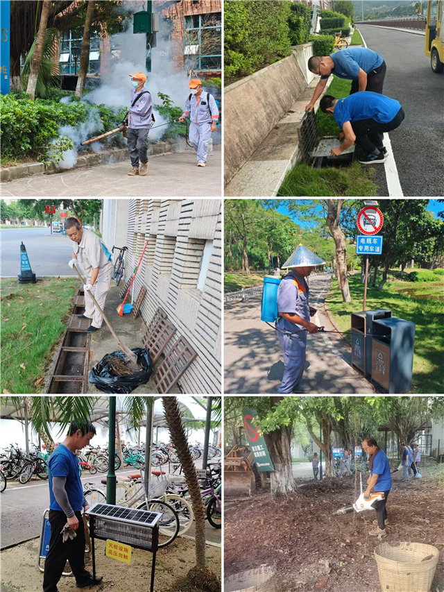 各单位切实落实责任,在本单位进行“清积水、清垃圾,无卫生死角”的工作,清除室内积水、杂物垃圾,铲除病媒孳生地。后勤、资产、基建和保卫等部门协同物业公司迅速行动,连续三天对宿舍区、教学区、施工工地、绿化带及垃圾站等蚊媒易滋生场所重点区域开展全面清理与专业消杀,从源头上阻断疾病传播链条。机关党委组织两场爱国卫生专项行动,组织广大党员到星仔山公园、荔枝岛公园开展环境清理。