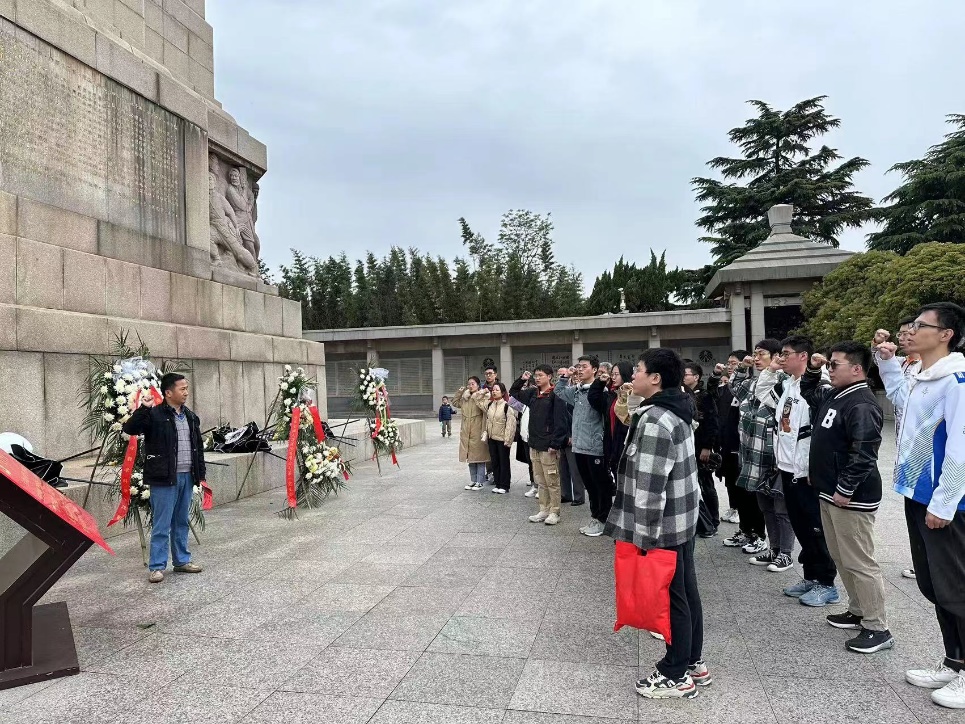 22日,师生们首站是淮海战役烈士纪念塔。师生们鞠躬致敬,献上花篮,并在学院党委书记唐仲伟的带领下,重温入党誓词。