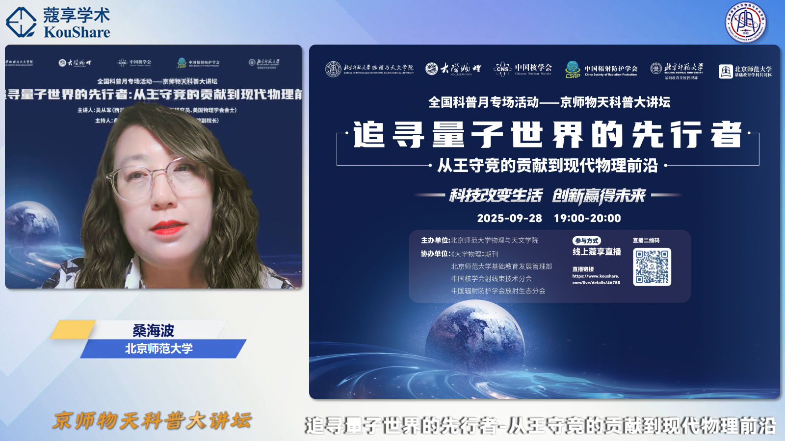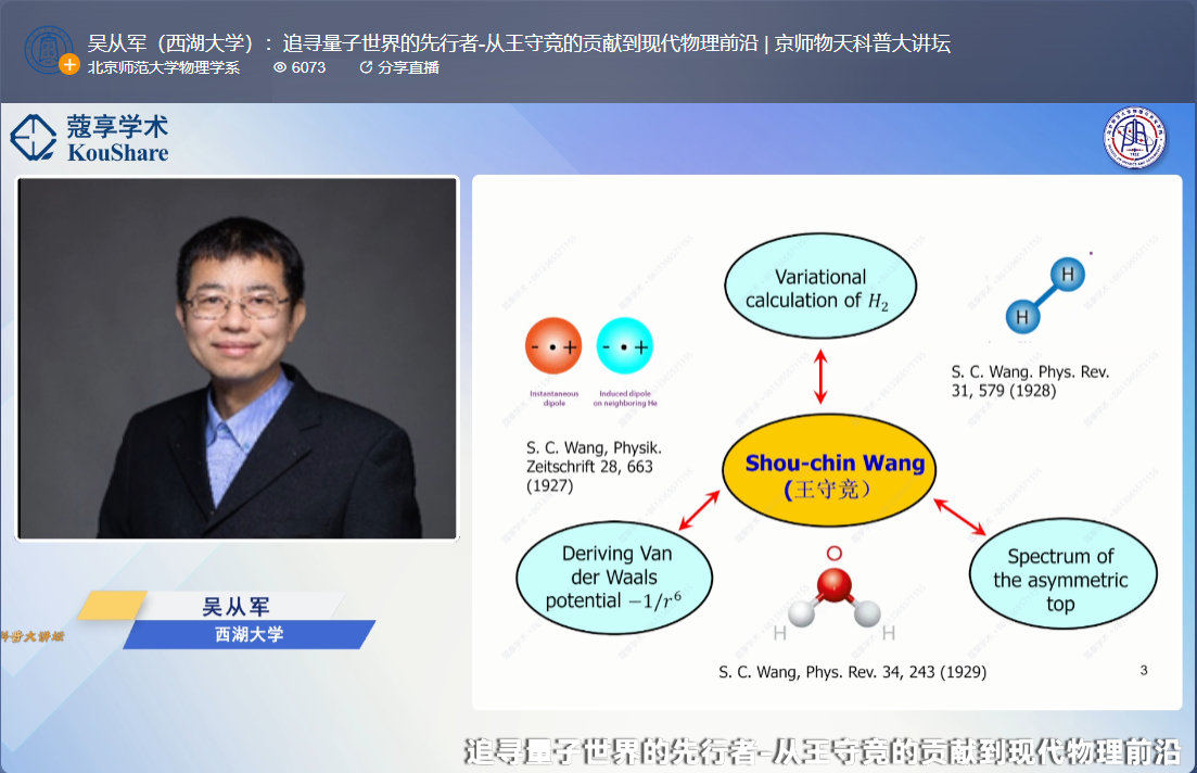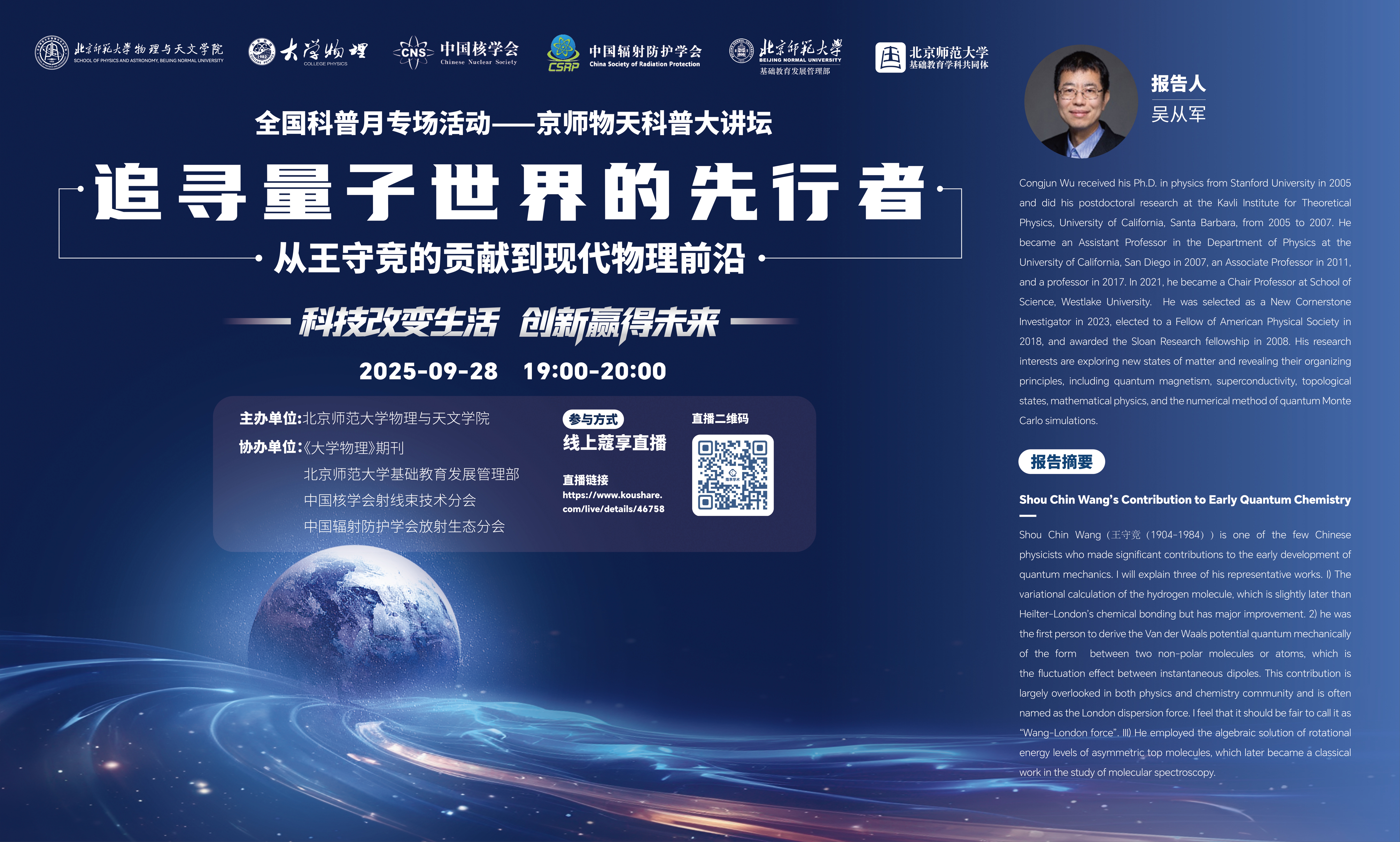 9月28日,在全国科普月“科技改变生活,创新赢得未来”的主题引领下,北京师范大学物理与天文学院举办了京师物天科普大讲坛线上专场活动。本次活动特邀西湖大学讲席教授、美国物理学会会士、新基石研究员吴从军,带来主题为“追寻量子世界的先行者——从王守竞的贡献到现代物理前沿”的精彩讲座。来自全国多所中学、北京师范大学附属基础教育学校、高校及科研院所的近万名师生与科技爱好者相聚云端,共同聆听这场跨越百年的科学对话。活动由物理与天文学院副院长、基础教育物理学科共同体秘书长、《大学物理》期刊主任桑海波主持。