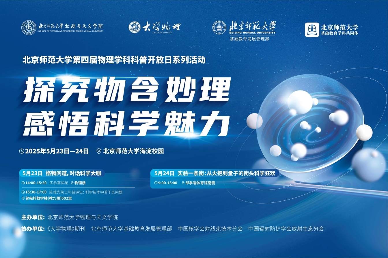 5月23日至24日,正值全国科技活动周之际,北京师范大学第四届物理学科科普开放日系列活动举办。活动由北京师范大学物理与天文学院主办,《大学物理》期刊、北京师范大学基础教育发展管理部、中国核学会射线束技术分会以及中国辐射防护学会放射生态分会协办。活动通过实验室探秘、院士科普讲坛、街头科学狂欢等形式,为北京师范大学、北京师范大学第三附属中学、北京师范大学昌平附属学校、北京师范大学良乡附属中学、北京师范大学第二附属中学等200余名大中学生及数千名科学爱好者呈现了一场科学与实践交融的盛宴。