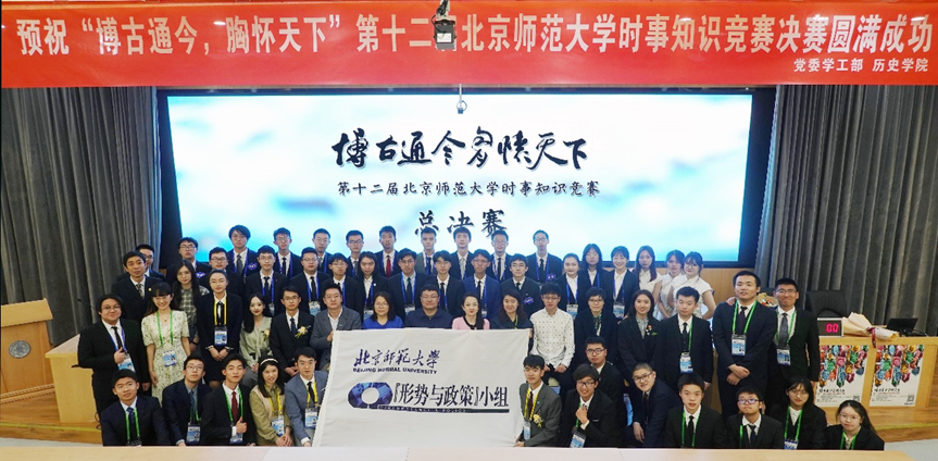 “博古通今 胸怀天下”北京师范大学时事知识竞赛自2010年起已举办十二届。比赛以当下时事关注为兴趣纽带,致力于探索时事研究与历史学专业学习间的融通与互动,培养学生的综合能力,成为历史专业课教学的重要延伸和历史学院人才培养的重要组成部分。比赛凭借新颖的赛制、内涵深广的知识背景、丰富的多媒体手段,成为“形势与政策”课程的第二课堂、高校思想政治教育创新的生动实践。
