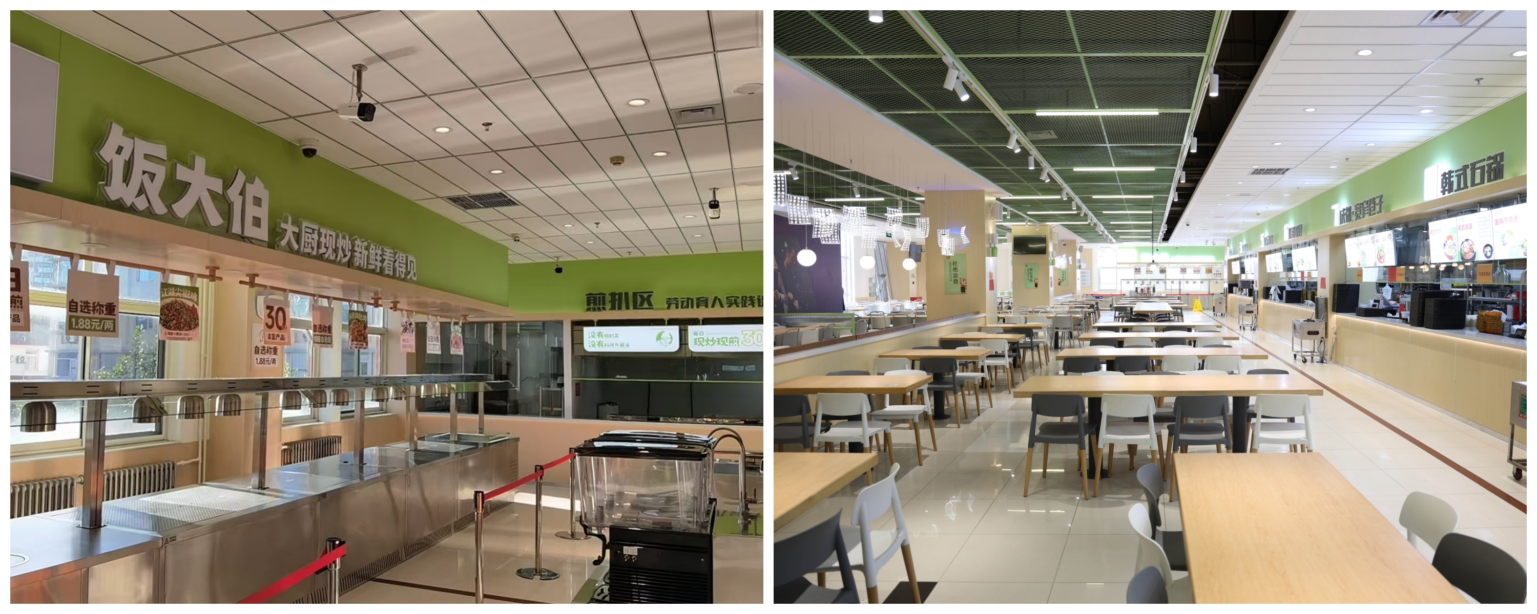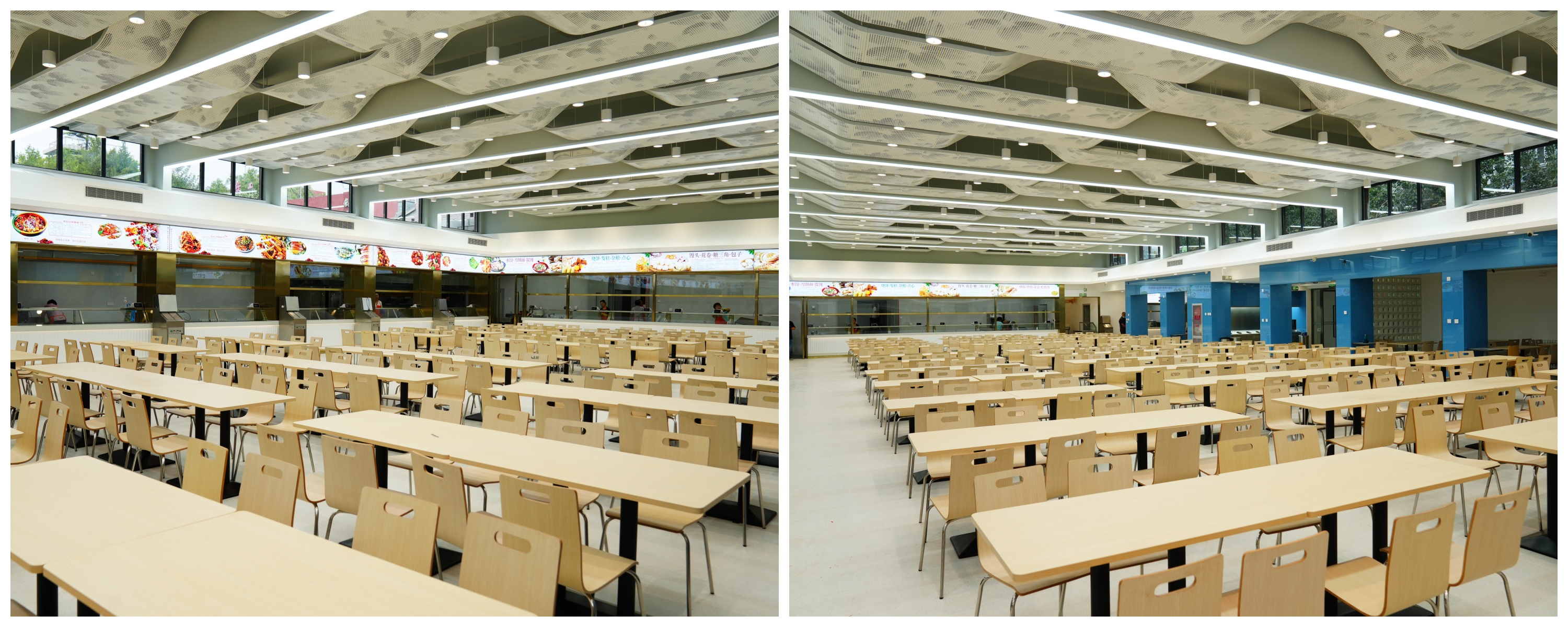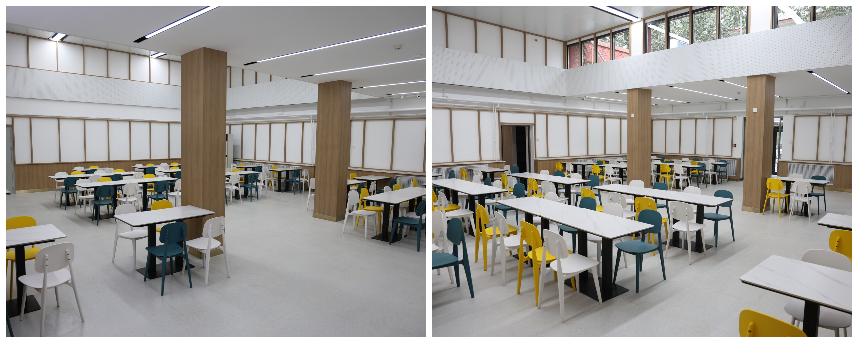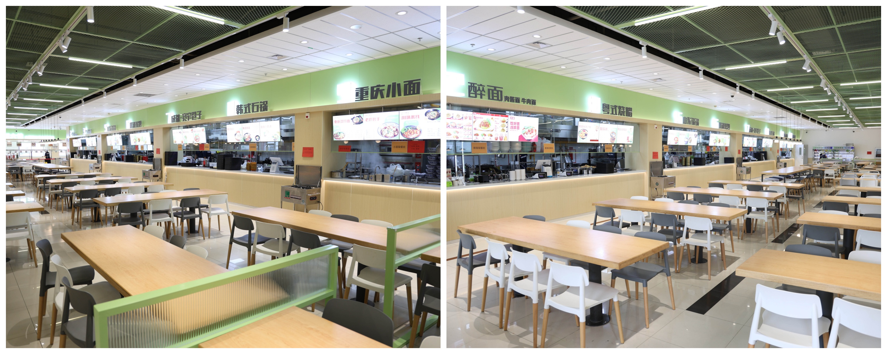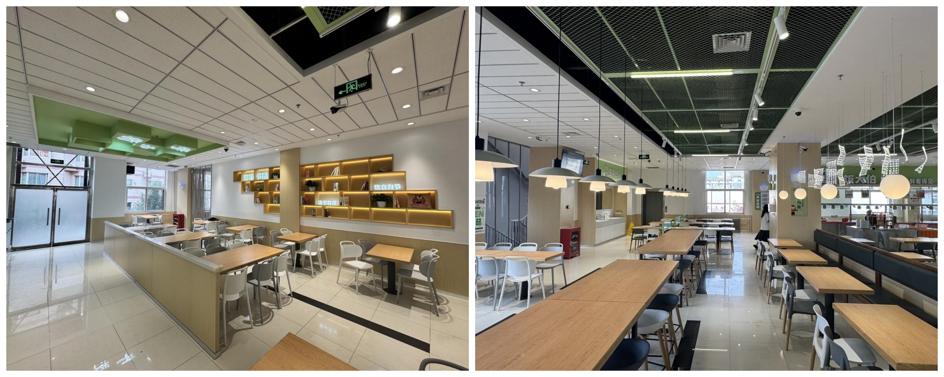对食堂大厅的墙面和顶面进行了全面翻新与软装升级,以寓意万物复苏、希望源泉的“春辰绿”为主色调。改造后的就餐环境优美,充满了现代感和生机活力。餐厅内增设了多个舒适的休闲卡座,将食堂从单纯的用餐场所,转型为集就餐、社交、自习功能于一体的“校园第三空间”,师生能在此享受美好“食”光。