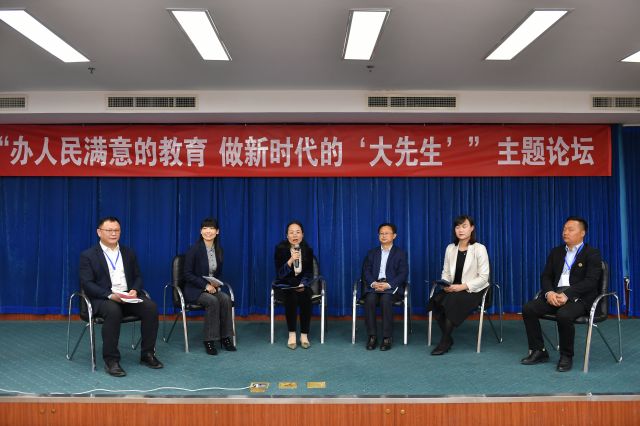 圆桌论坛环节,中国教育报校长周刊主编赵秀红与学员代表王羽、郑义富、汤吟莹、朱祥烈、沙晓付就“怎样办人民满意的教育,做新时代‘大先生’”展开对话。